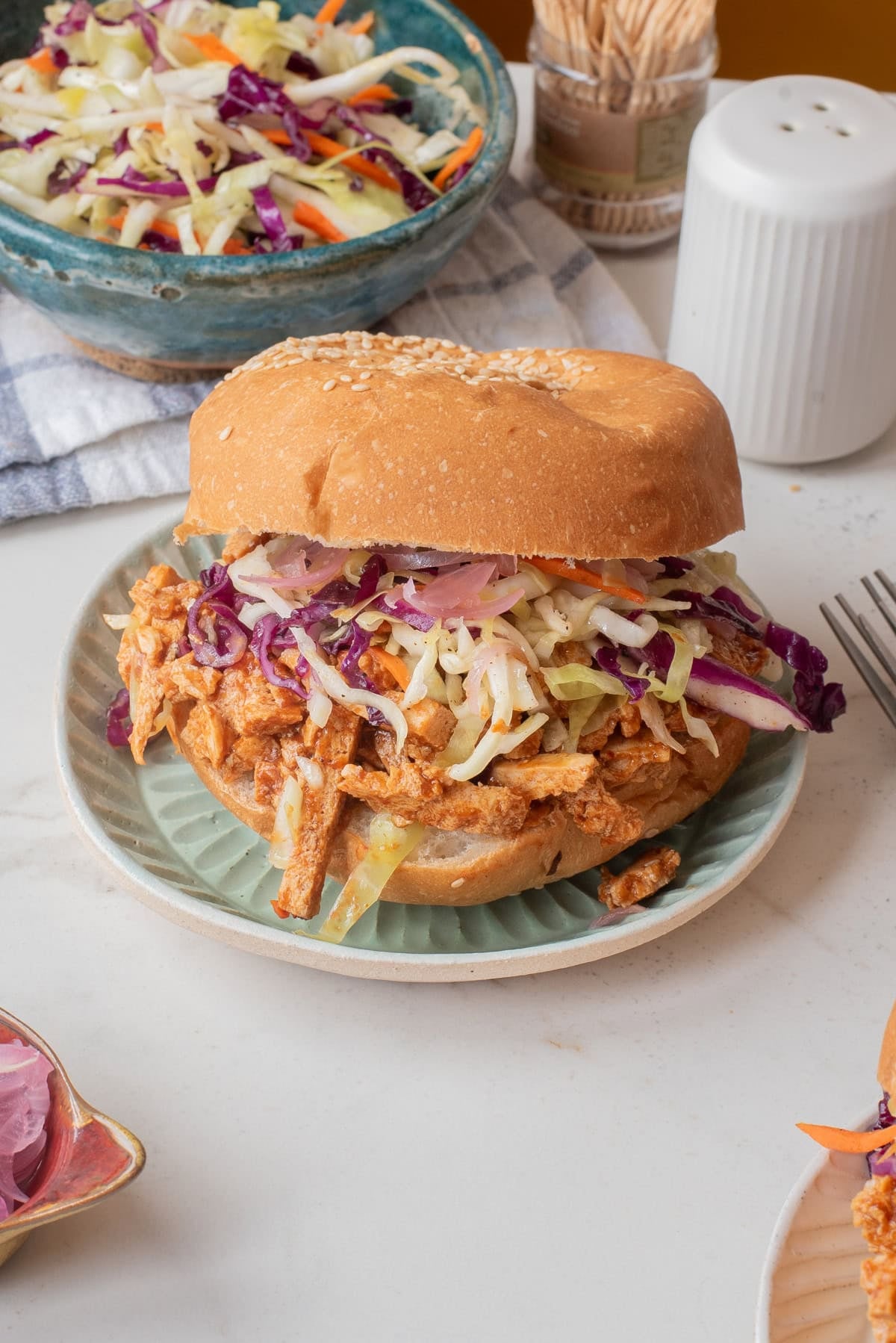 - The tofu: Three blocks for six sandwiches gives you generous portions without overwhelming the bun. Extra-firm is essential — anything softer falls apart when you tear it. Press for at least 15 minutes; the drier the tofu, the crispier the edges and the better it absorbs the sauce. A tofu press makes this completely hands-off, or wrap in clean kitchen towels and set a heavy pan on top.