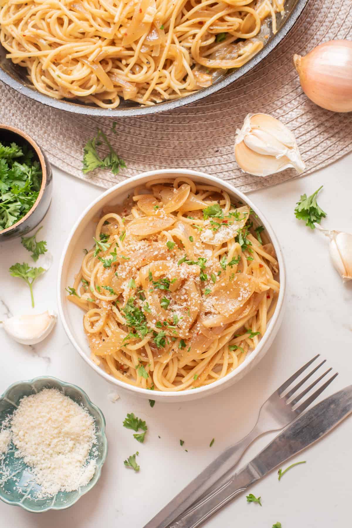 To make my creamy onion pasta, you’ll need long pasta like spaghetti, linguine, or fettuccine; plenty of sweet or yellow onions; garlic; butter and olive oil; Parmesan cheese; a splash of dry white wine; a pinch of sugar and salt; and a dash of red chili flakes for a hint of spice.
