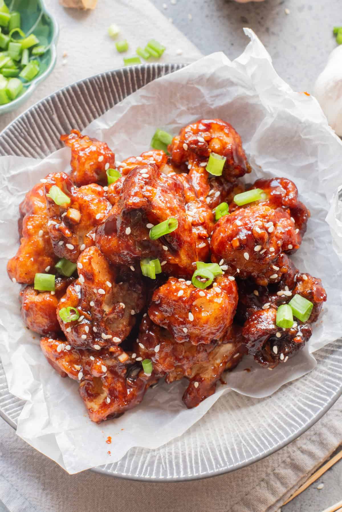 I had my first version of Korean fried cauliflower in Seoul years ago — a tiny restaurant tucked between two street markets that smelled like sesame oil and chili paste from half a block away. The chef served fried chicken tossed in gochujang sauce, and I remember thinking: cauliflower could totally hold its own here.