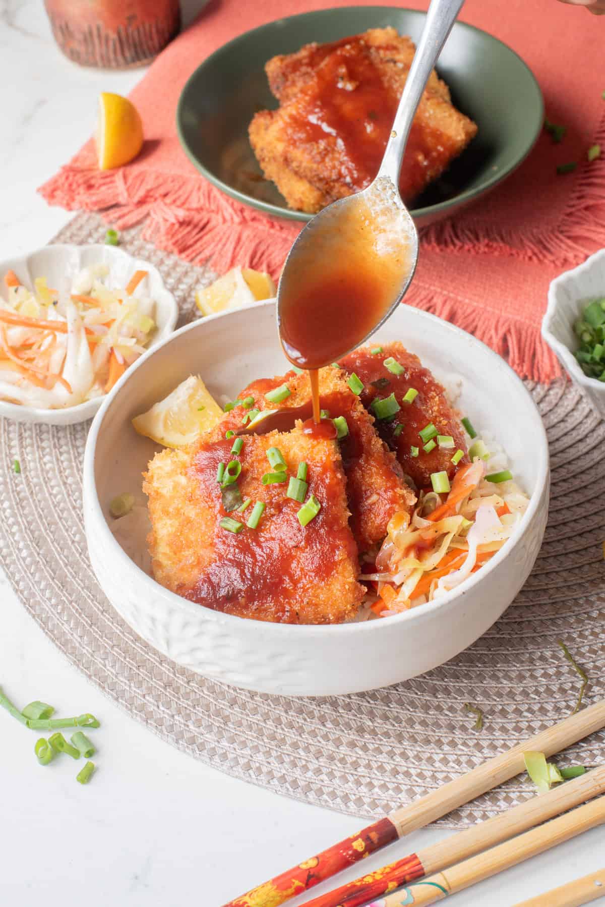 - Serve the katsu over rice, top with slaw and tonkatsu sauce, and enjoy!