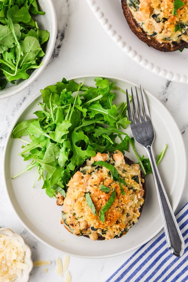 My stuffed portobello mushrooms are loaded with spinach, cannellini beans, sun-dried tomatoes, and a creamy blend of cottage cheese and ricotta — all topped with crispy Parmesan panko. Pre-roasting the caps first releases their moisture so they stay tender without getting soggy. Just delicious all around!